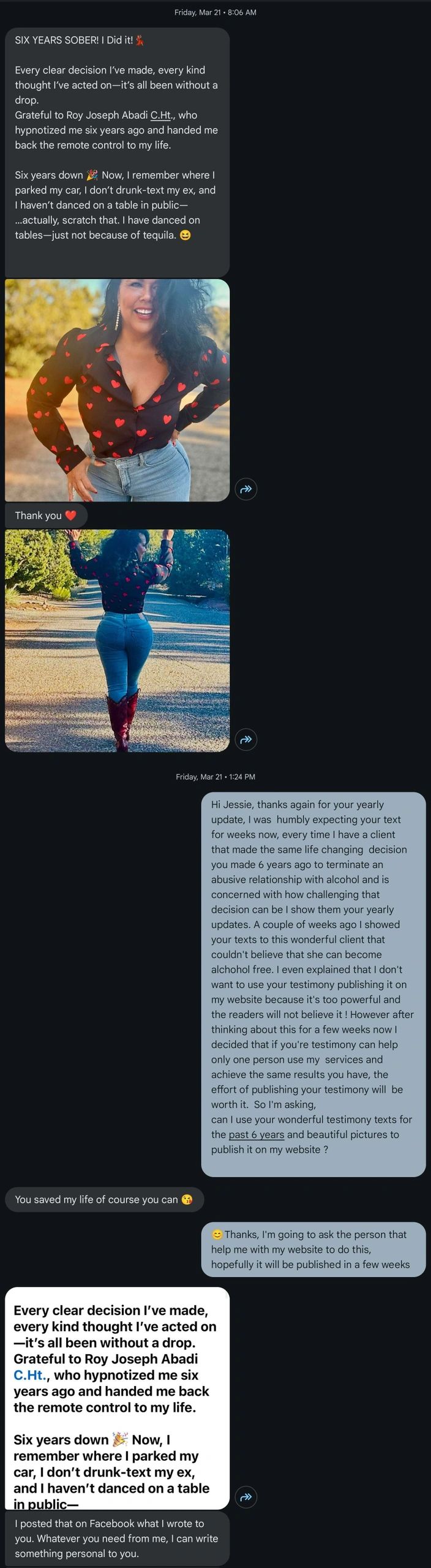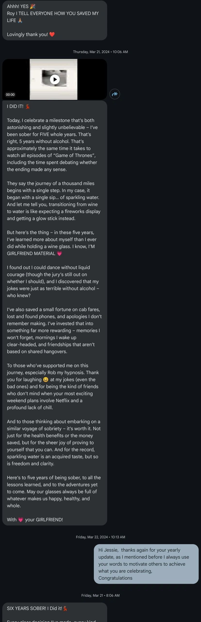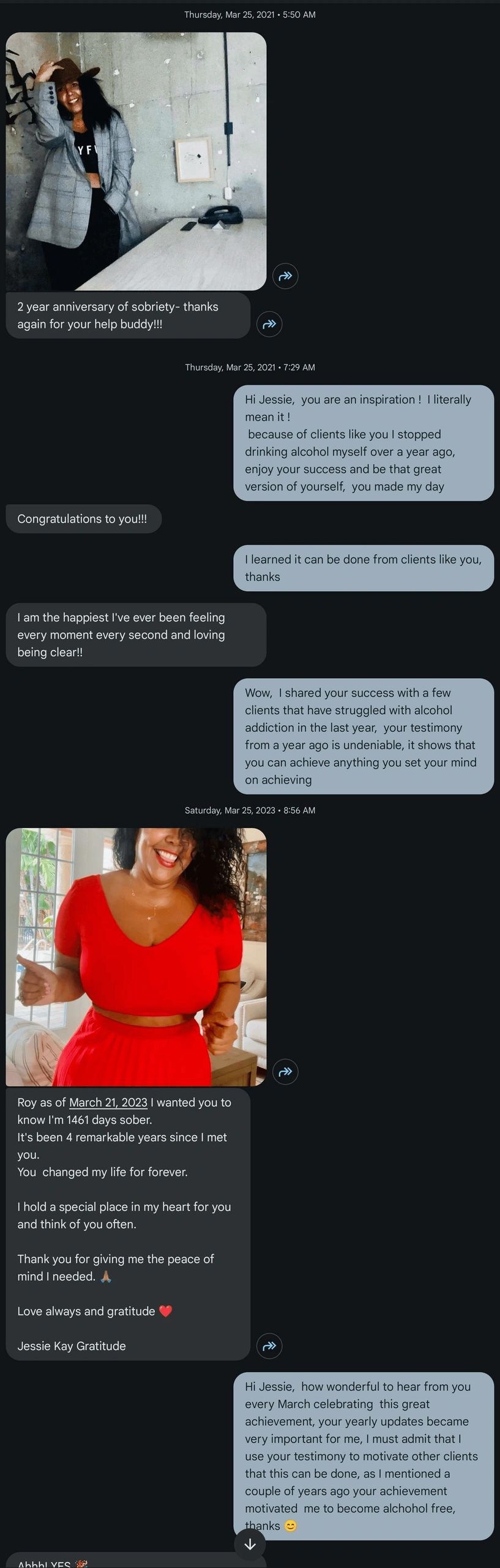 This is a thread of text messages from a client that used my services to help her stop drinking alcohol in the beginning of 2019. In March of 2020, the client Jessie texted her first yearly March texts celebrating her sobriety.